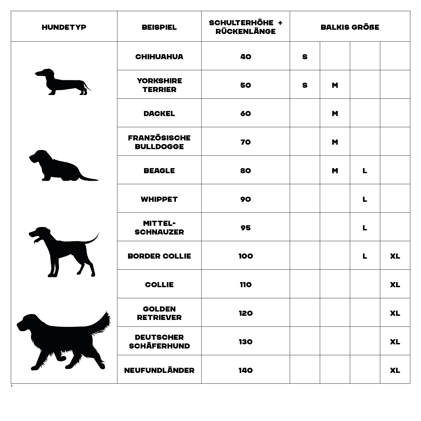 Anhand der Summe aus Schulterhöhe und Rückenlänge lässt sich die optimale Größe für dein Balkis Hundebett bestimmen.