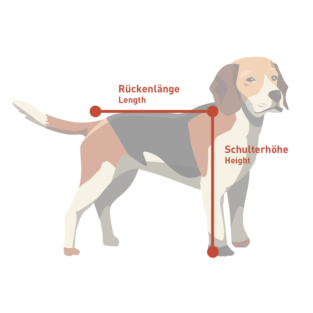 Miss die Rückenlänge und die Schulterhöhe deines Vierbeiners. Mit der Summe aus beiden Werten kannst du ganz einfach die perfekte Balkis Größe aus der Tabelle wählen.